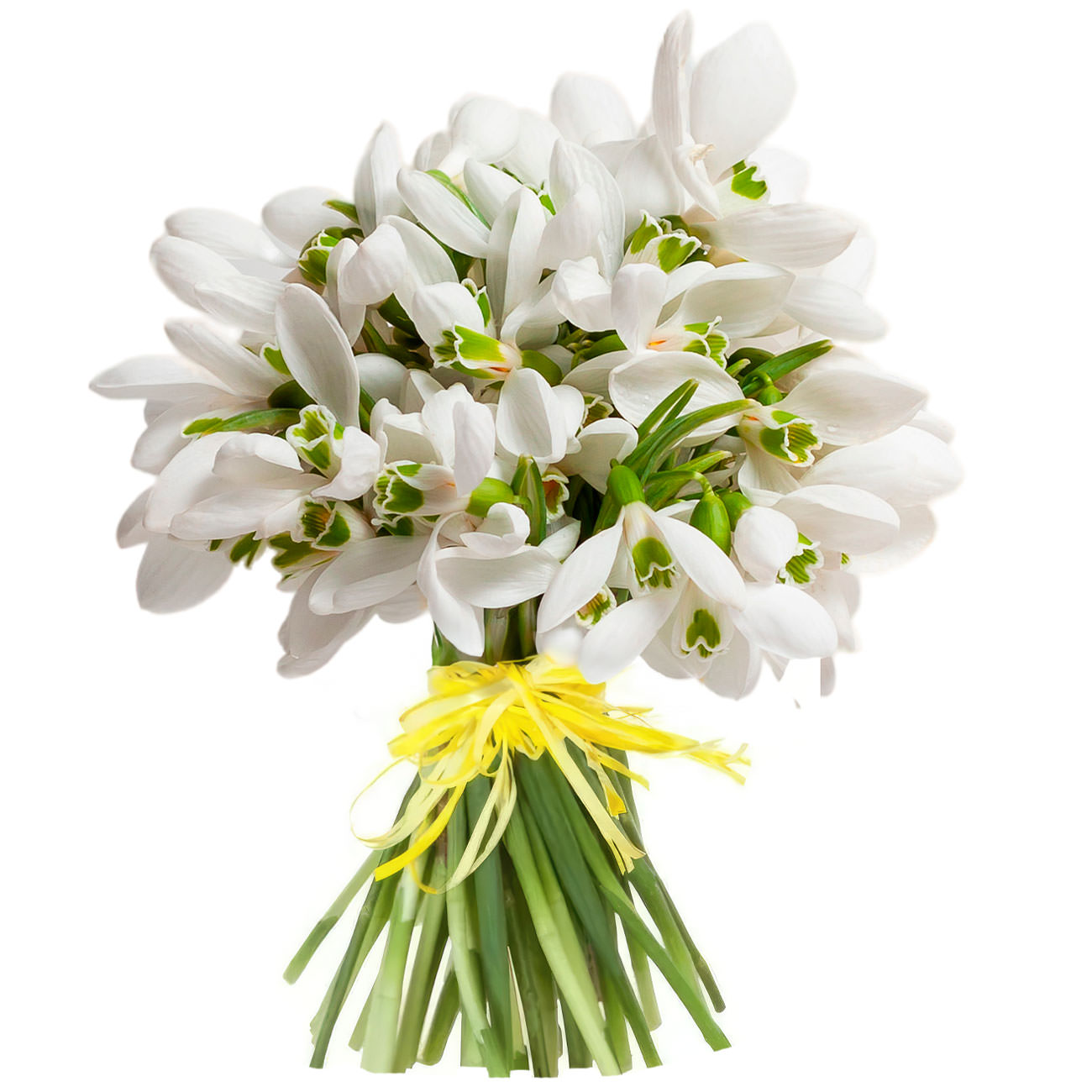 Этот букет в белой цветовой гамме вызывает ощущение свежести и чистоты. В его составе исключительно подснежники, которые придают ему неповторимый шарм. Букет перевязан яркой жёлтой лентой, что добавляет изюминку и подчёркивает контраст. Композиция создаёт атмосферу весны и обновления. Идеально подойдёт для поздравления любимой на День влюблённых.