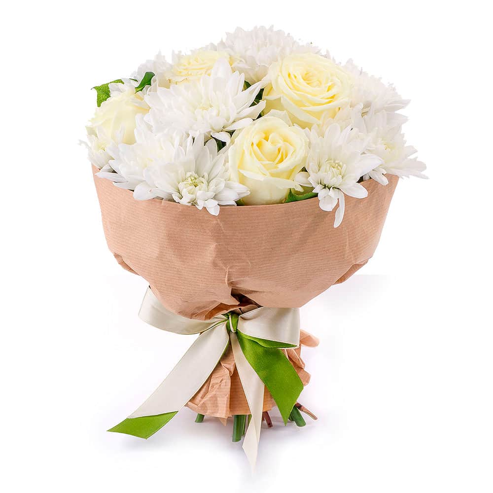 Элегантная белоснежная палитра букета дарит ощущение чистоты и свежести. В составе присутствуют белые одноголовые розы и кустовые хризантемы. Букет оформлен в крафт-бумагу с декоративной лентой, что придаёт ему стильный вид. Этот букет создаёт атмосферу изысканной элегантности. Великолепный выбор для девушки на 14 Февраля.