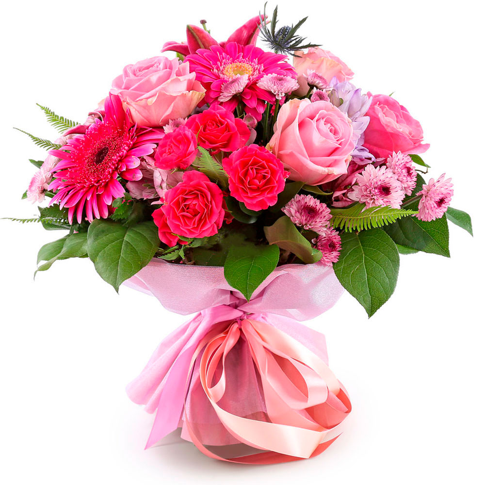 Этот букет поражает нежностью и разнообразием оттенков розового цвета. В составе: роза одноголовая нежно-розовая, гербера розовая, хризантема кустовая розовая, лилия розовая, альстромерия розовая, эвкалипт и эрингиум. Упакован в матовую пленку с крафт-бумагой и розовой лентой. Создаёт атмосферу романтики и нежности. Идеален для подарка на день рождения для любимой женщины.