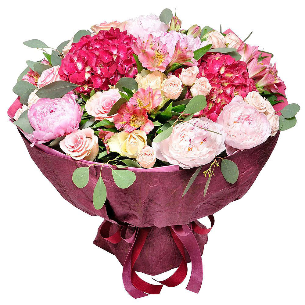 Теплые розовые оттенки и нежные кремовые тона создают атмосферу утренней свежести. В букете пион розовый, гортензия розовая, роза кустовая нежно-розовая, роза одноголовая кремовая и розовая, альстромерия розовая, эвкалипт. Упакован в матовую пленку и крафт-бумагу бордового цвета с декоративной лентой. Эта композиция прекрасно подойдет на годовщину для любимой женщины.
