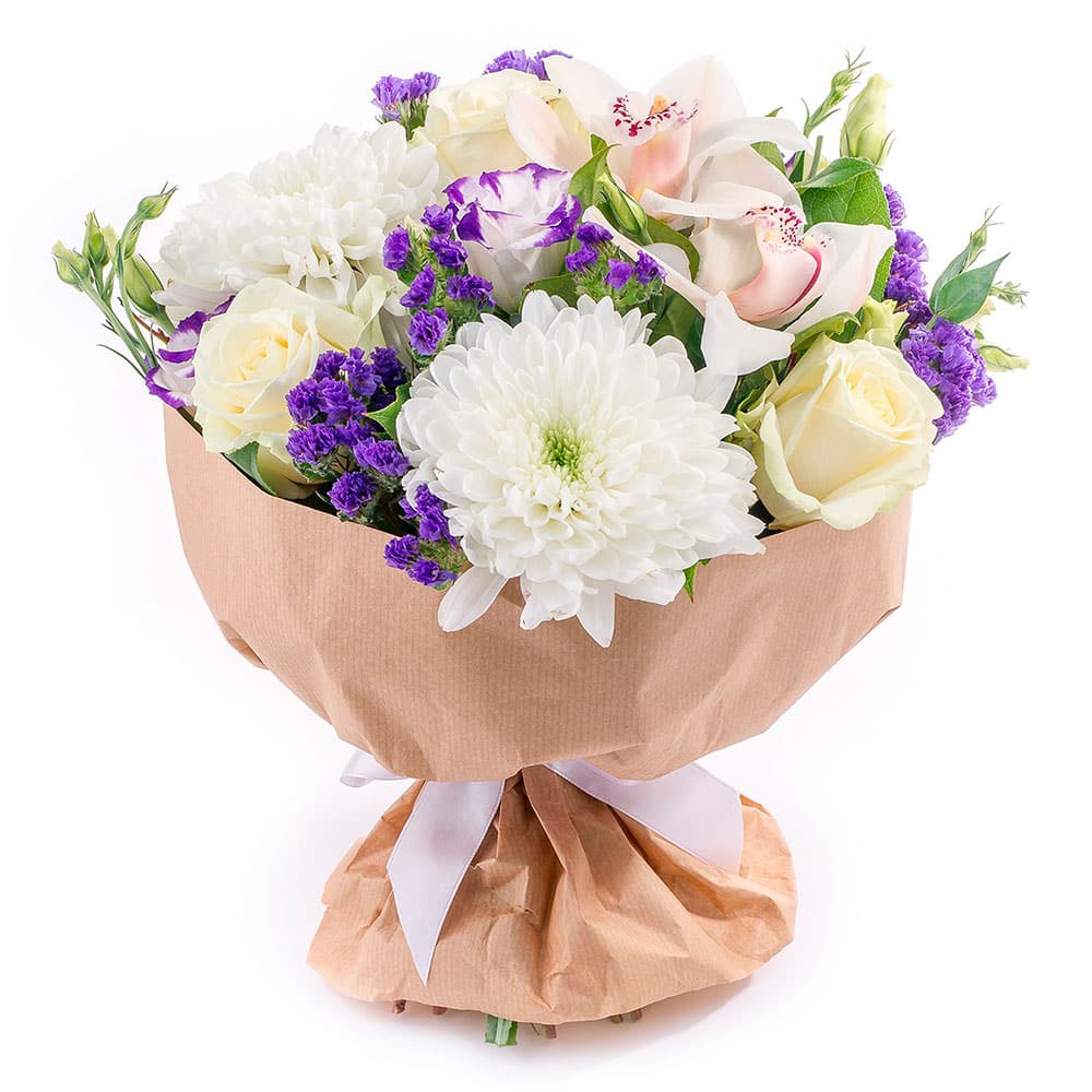 Этот букет в бело-фиолетовых тонах вызывает чувство нежности и элегантности. В его составе белая одноголовая хризантема, белая роза, белая орхидея и статица. Упакован в крафт-бумагу, перевязанную белой атласной лентой, что придаёт композиции стильный вид. Создаёт атмосферу утончённости и гармонии. Прекрасный подарок для любимой на годовщину.