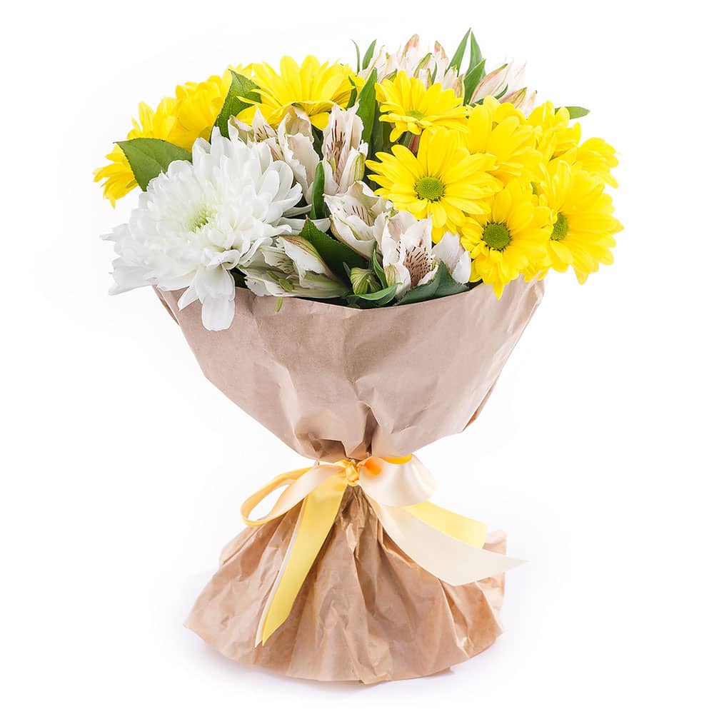 Яркие жёлтые и белые оттенки создают атмосферу радости и свежести. В составе букета: белая одноголовая хризантема, жёлтая кустовая хризантема и белая альстромерия. Упакован в крафт-бумагу с жёлтой атласной лентой, завязанной аккуратным бантом. Композиция приносит ощущение весеннего пробуждения. Прекрасный подарок для мамы на День матери.