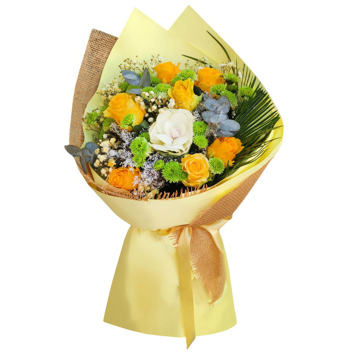 Яркие жёлтые и зелёные оттенки этого букета сразу привлекут внимание и поднимут настроение. В состав входят жёлтые одноголовые розы, зелёные кустовые хризантемы, брассика, гипсофила, листья пальмы и эвкалипт. Упакован в жёлтую матовую плёнку и декоративную сетку, а также перевязан атласной лентой. Эта композиция создаёт атмосферу радости и свежести, идеально подходящая для поздравления коллеги с повышением, особенно для руководителя.