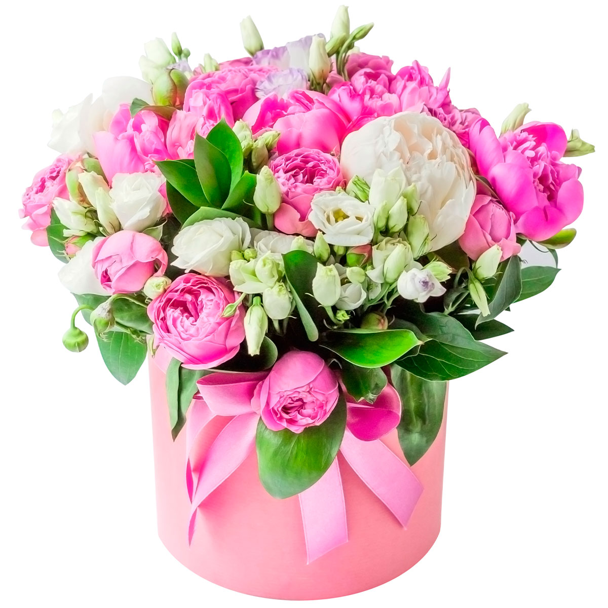 Эта композиция в нежных бело-розовых тонах вызывает ощущение лёгкости и радости. В составе букета белый и розовый пион, розовая кустовая пионовидная роза и белая эустома. Все цветы аккуратно размещены в шляпной коробке розового цвета с атласной лентой. Эта композиция создаёт атмосферу романтики и утончённости, идеально подходит для подарка на День матери для любимой мамы.