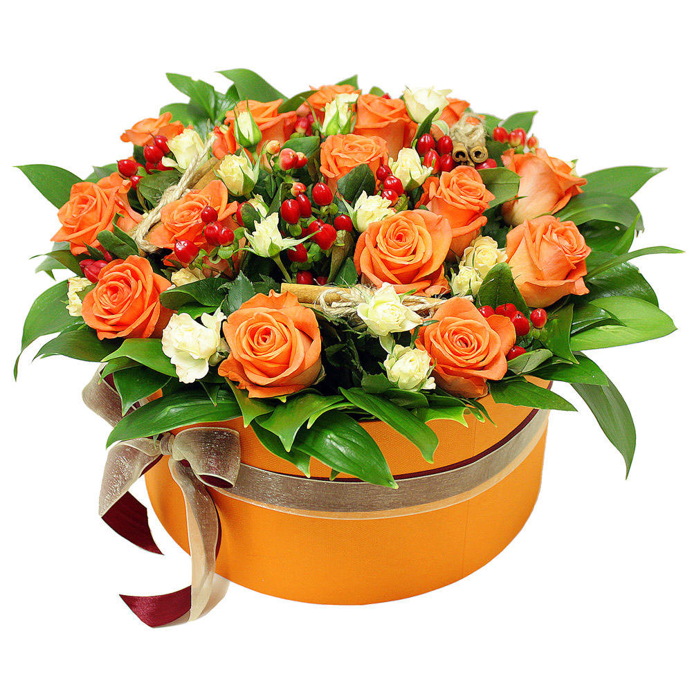 Яркие оранжевые и белые оттенки создают атмосферу радости и тепла. Композиция включает одноголовую оранжевую розу, кустовую белую розу и гиперикум, дополненные зеленью аспидистры. Упаковка представлена в виде круглой шляпной коробки ярко-оранжевого цвета с лентой. Этот букет станет прекрасным подарком для любимой женщины на День матери.