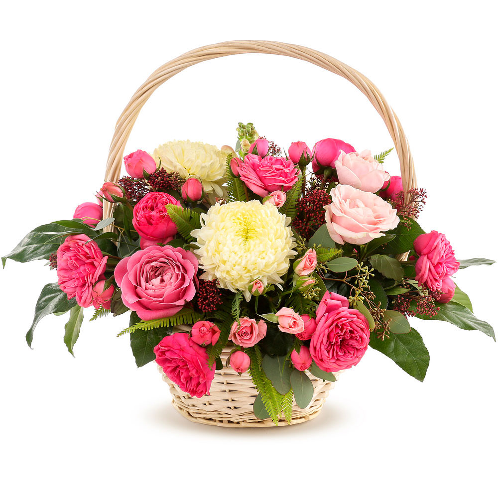 Яркие розовые и белые оттенки придают композиции свежесть и легкость. В составе кустовая розовая роза, одноголовая белая хризантема, скимия, папоротник, эвкалипт, аралия и одноголовая розовая роза. Композиция оформлена в элегантной плетёной корзине. Отлично подойдет для романтического вечера для любимой женщины.